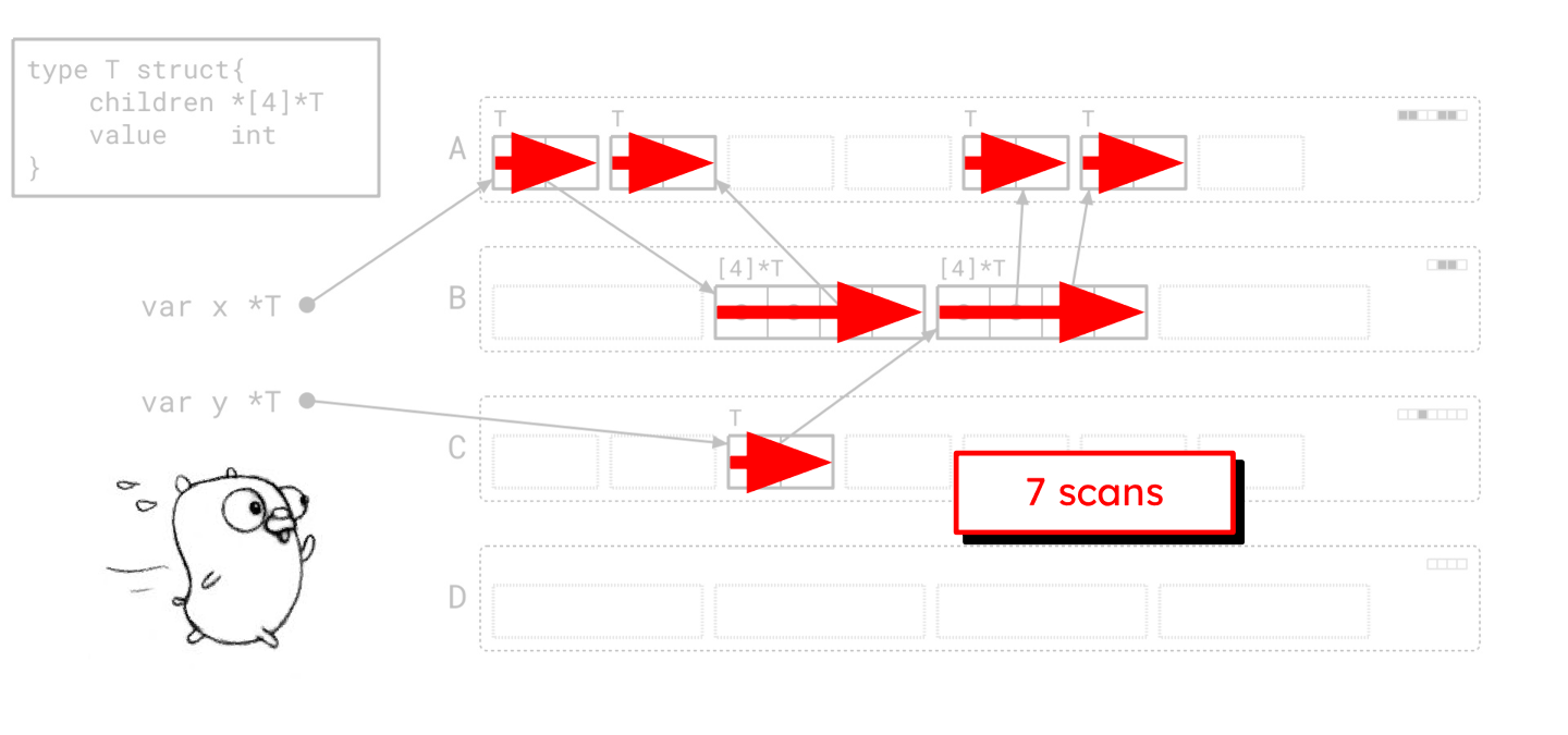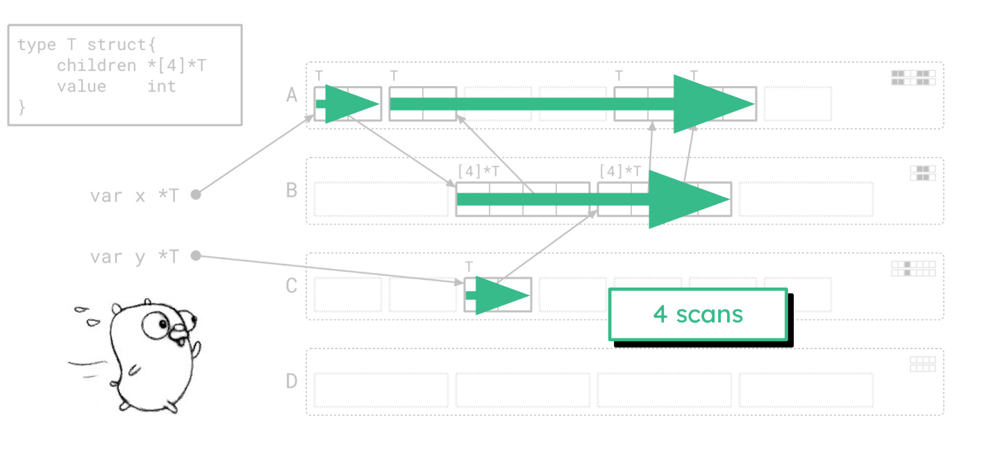 Let’s make that more concrete by looking at our example again. I’ve overlaid the heap here with the path that we took. Each left-to-right arrow represents a piece of scanning work that we did and the dashed arrows show how we jumped around between bits of scanning work.